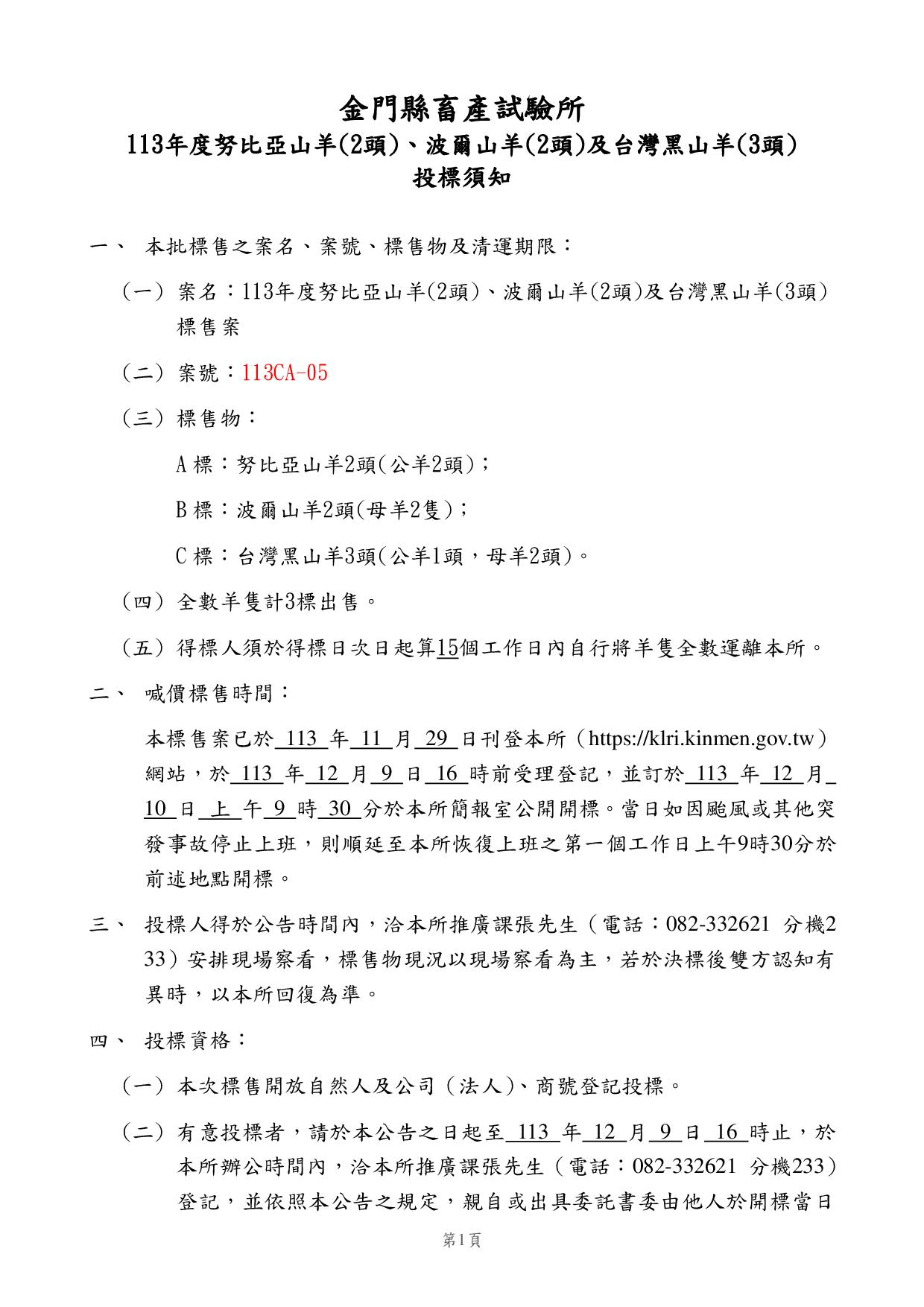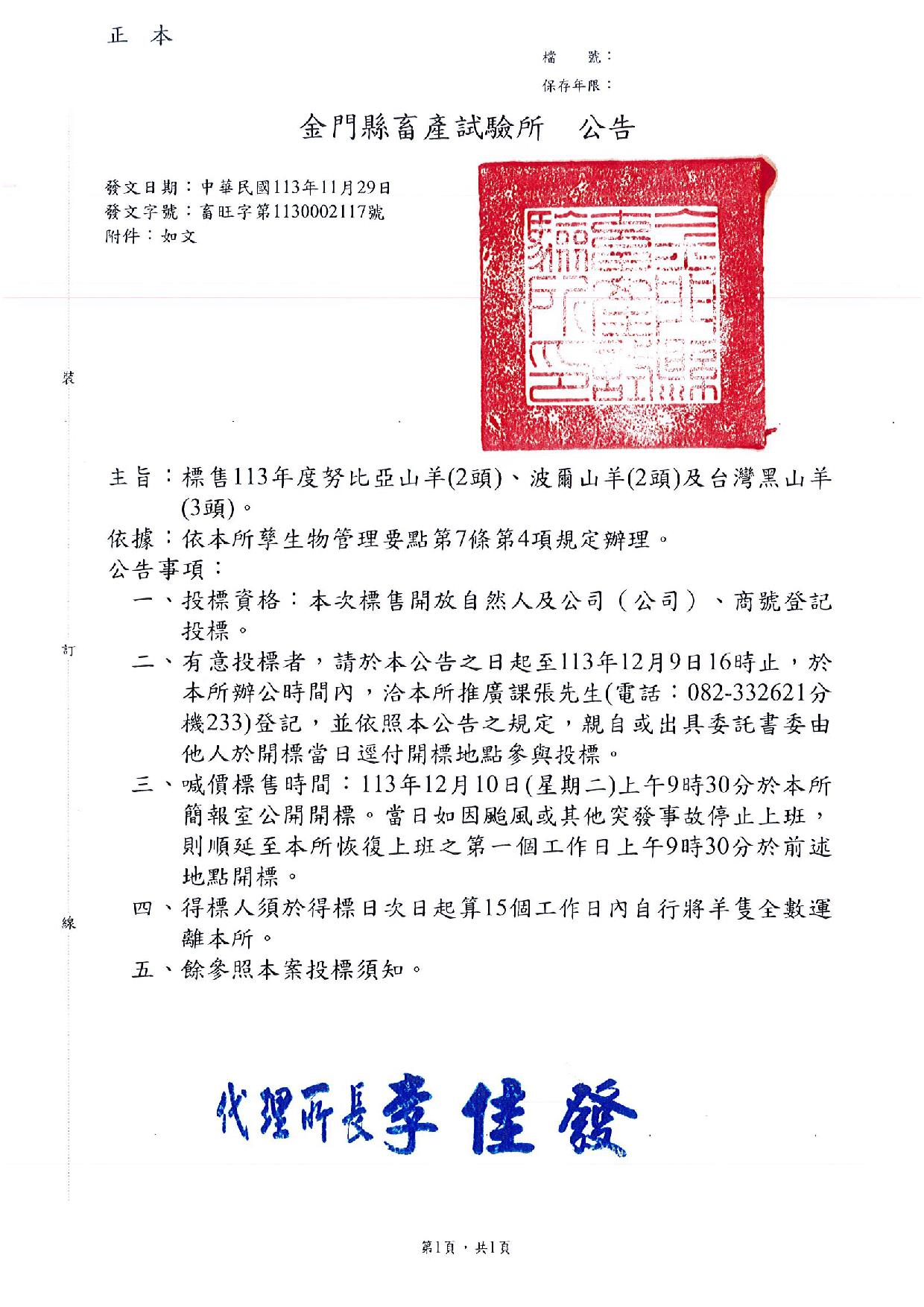 公告標售奴比亞山羊2頭,波爾山羊2頭,台灣黑山羊3頭。